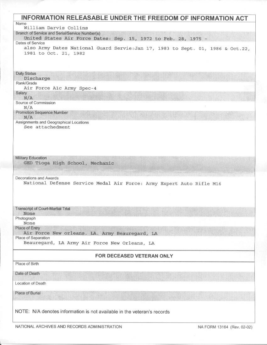 17 YEARS OF MILITARY SERVICE (5 YEARS AIR FORCE, 12 YEARS ARMY), CAN'T TALK ABOUT DETAILS OR SPECIFIC UNITS OF ASSIGNMENTS BECAUSE OF THE TOP SECRET CLASSIFICATIONS AND CAUSES HIM TO FLASH BACK TO HIS MANY FRIENDS THAT WERE KILLED. HE CLAIMS OF THE NINE INDIVIDUALS HE WAS ASSIGNED WITH IN VIETNAM, ONLY TWO ARE REMAINING, HIMSELF AND A MICHAEL SMITH (MICHAEL SMITH CLAIMS HE SERVED WITH COLLINS THROUGHOUT VIETNAM AND BACKS UP EVERYTHING COLLINS SAYS-- MICHAEL SMITH CLAIMS MUCH THE SAME AS COLLINS EXCEPT HE STATES HE WAS WITH THE 17TH SPECIAL FORCES, See MICHAEL SMITH )