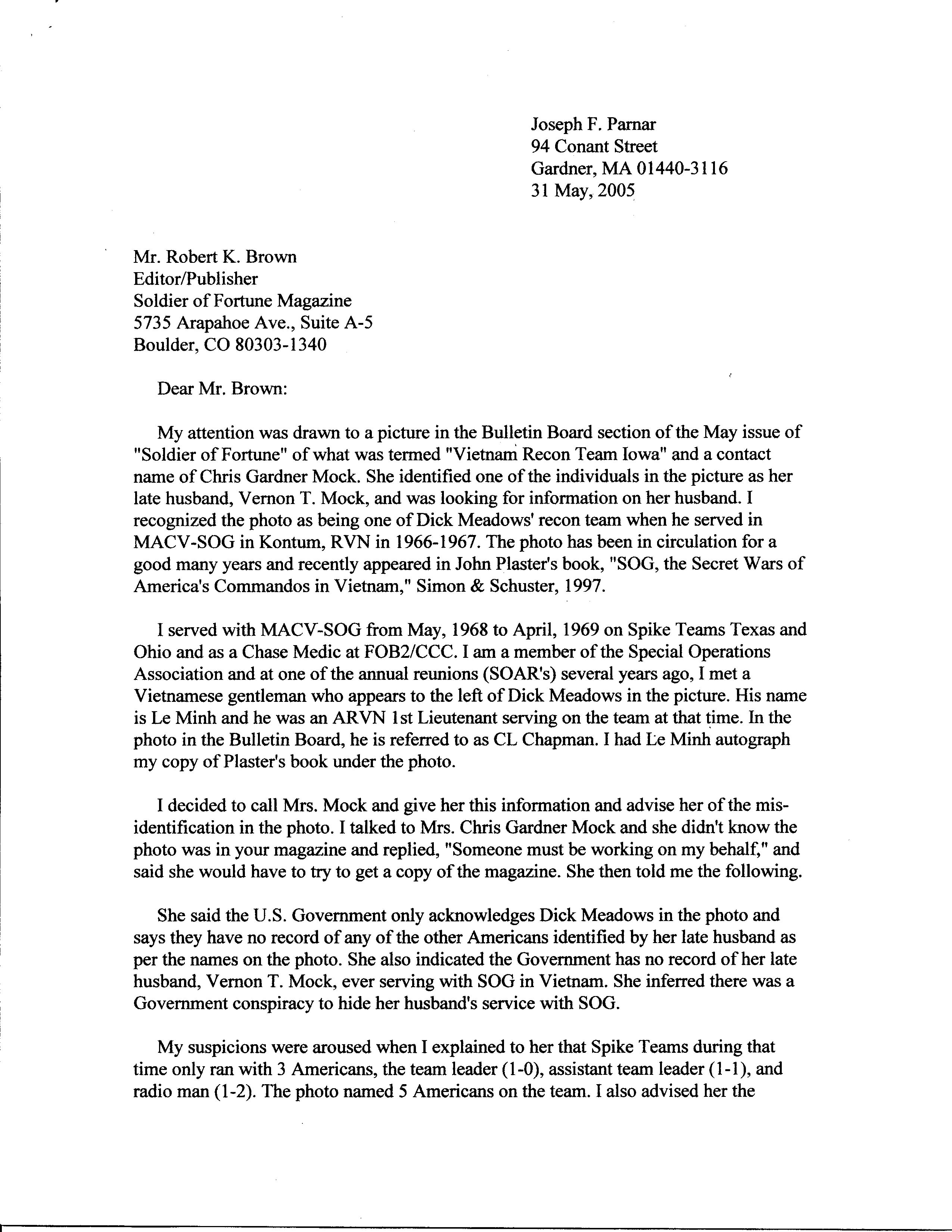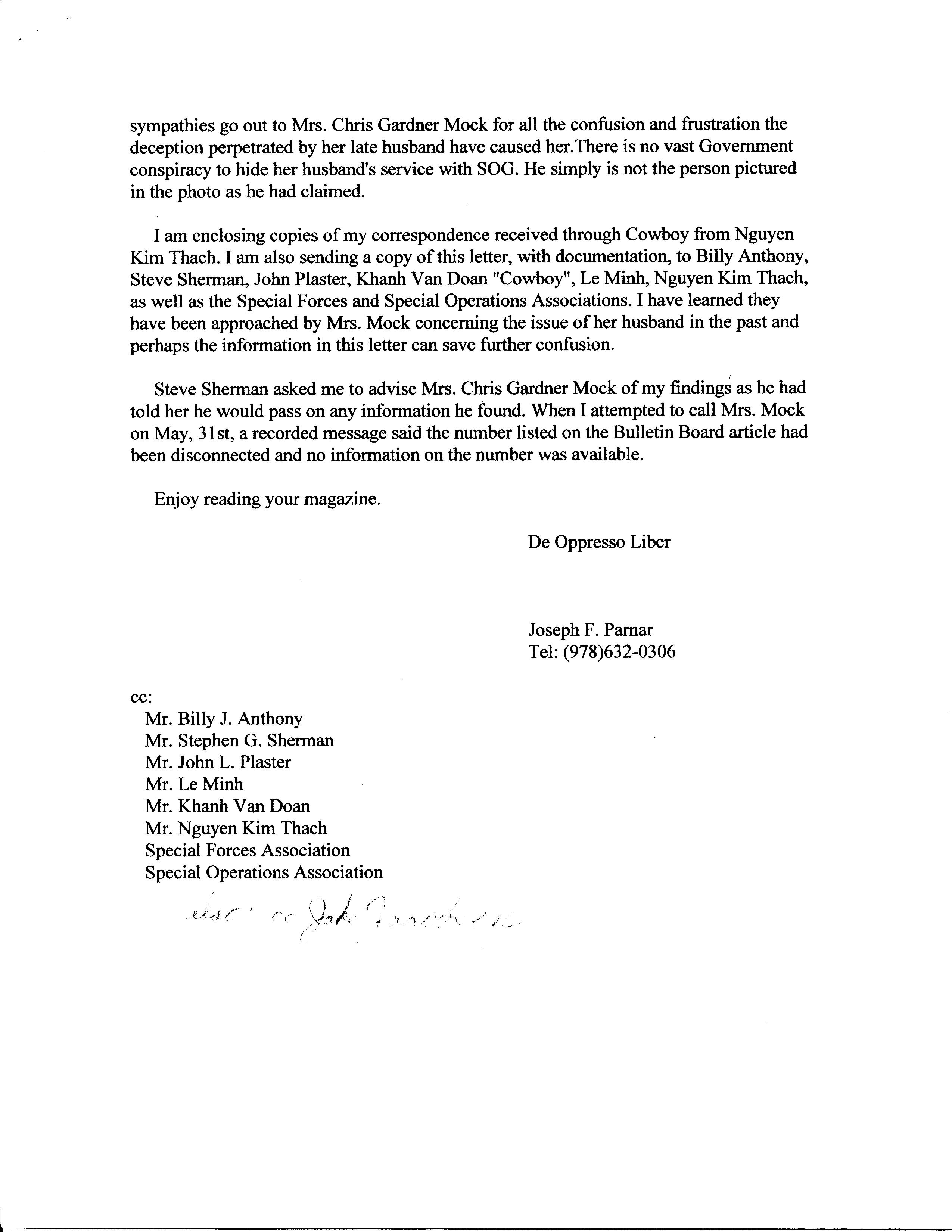 LETTER TO SOG1RLNOE REGARDING VERNON T MOCK