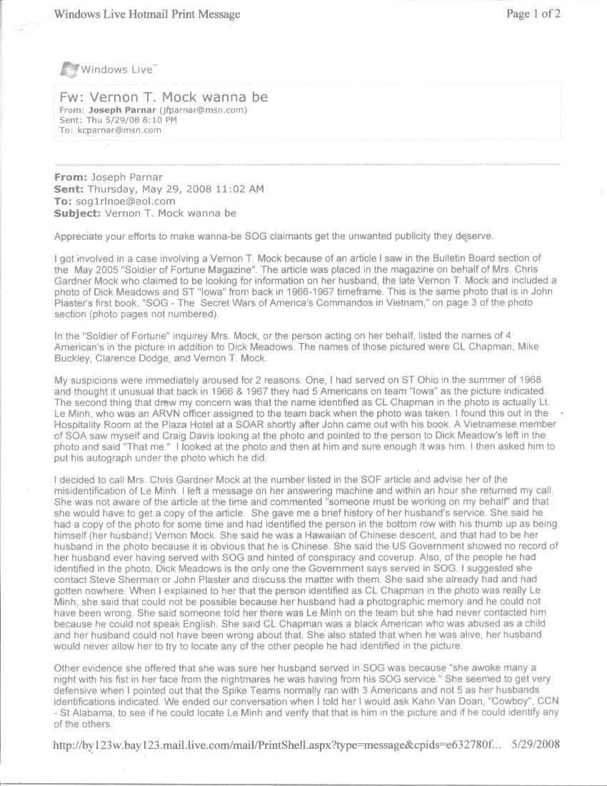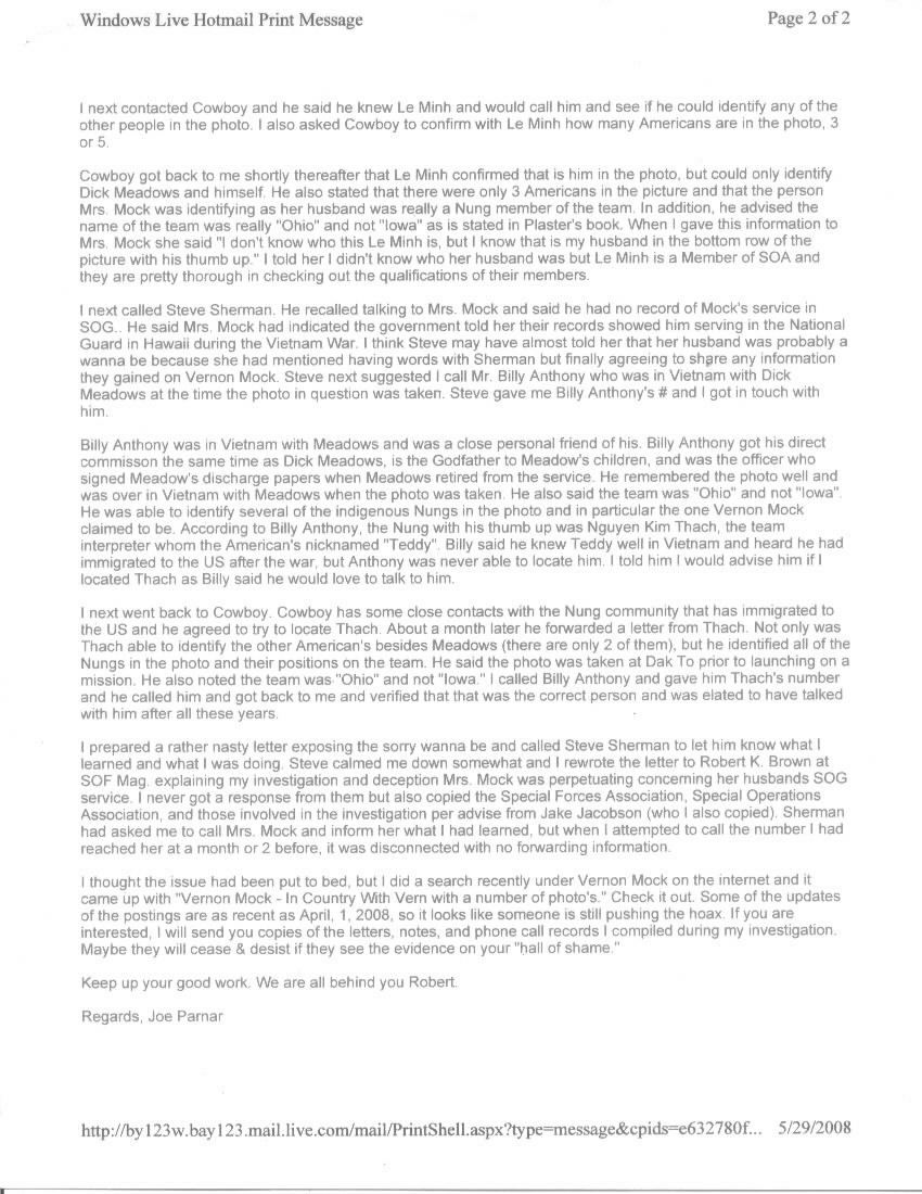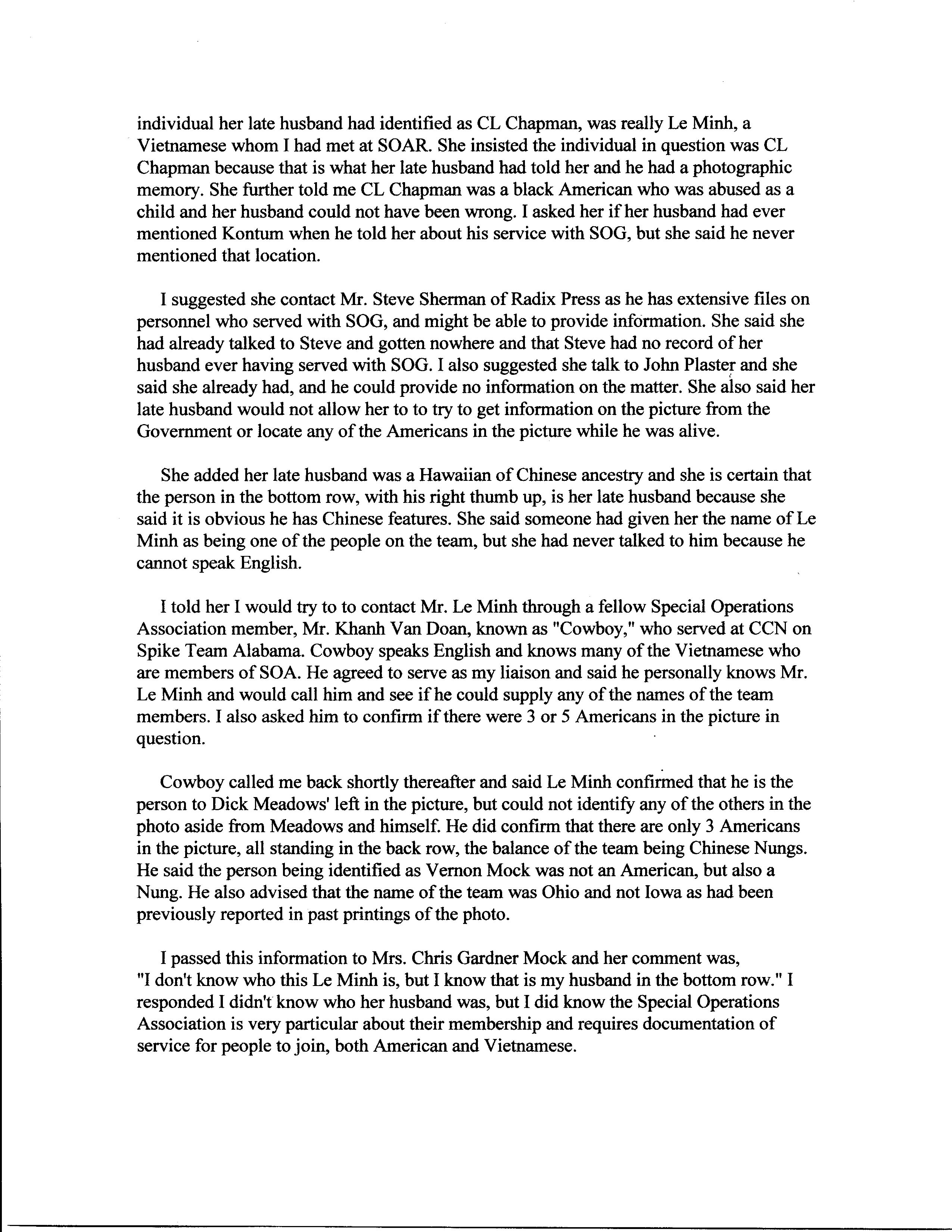Seems the late Vernon T. Mock has stolen the identity of "Nguyen Kim Thach'', nicknamed "Teddy" by the Americans on his team. Thach was the interpreter on Spike Team Ohio in 1966-67 under team leader Dick Meadows.. Mock's wife claims Mock was a Hawaiian of Chinese descent and had for sometimes said he was the person in the picture with his thumb up. According to his wife the military has no record of Mock serving in Vietnam or SOG and hints at a conspiracy and cover-up (isn't that always the bull the Wannabe come up with?). What a sorry piece of shit Mock is to leave his family with such a fraud.