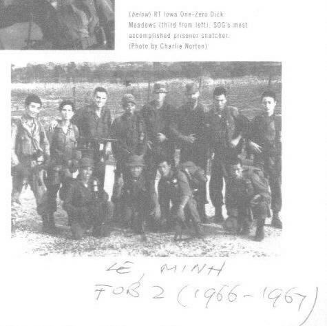 STANDING LEFT TO RIGHT: Huy, Wong A Cau, MSG Meadows, 1st Lt Le Minh, SFC James A Simpson?, SFC Charles N. "Chuck" Kerns, Can, and Dau KNEELING: LEFT TO RIGHT: Lieu A Sang, Nguyen Kim Thach "Teddy", Nhuc, Ly A Duong. Positions held by team members: Americans-MSG Meadows-One Zero; SFC Simpson-One-one; SFC Kerns-One two. Vietnamese: Sang-Point Man; Can-Compass Man; Thach-Interpreter; Minh-ARVN; Huy-?; Can-Radio Man; Nhuc-?; Duong-Rear Man; Dau-Rear Man (The identity of the 3rd American identified by Thach as ?Simpson? The assumption is made that this is SFC James A. Simpson, the only Simpson listed in Sherman's "Who's Who" that seems to fit the time period under the FOB2 section).
